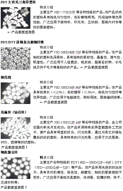 差别化民用长丝产品--公司主导产品之一。能生产各种规格的FDY长丝、加弹丝、POY长丝、牵伸丝、复合和网络丝、涤锦复合超细(FDY、DTY、DT)纤维、锦纶新合纤、阳离子长丝、阳离子加弹丝、亮扁丝、绣花线、高强缝纫线、特种长丝和名类有色丝等系列产品。产品质量优良、规格齐全、广泛应用于纺织、服装、装饰等领域.
